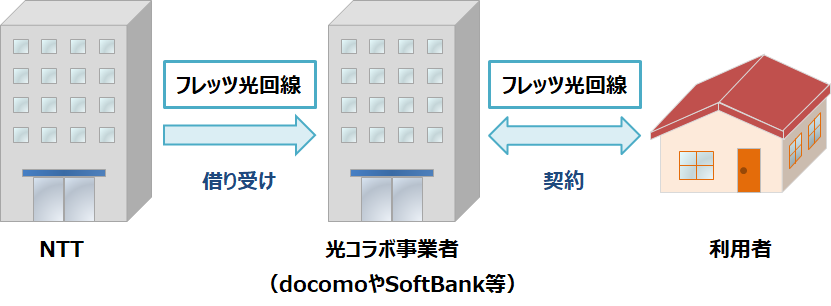 光コラボとは「NTTが提供するフレッツ光回線を光コラボ事業者(プロバイダ)が借り受けて、利用者に提供するサービス」のことです。