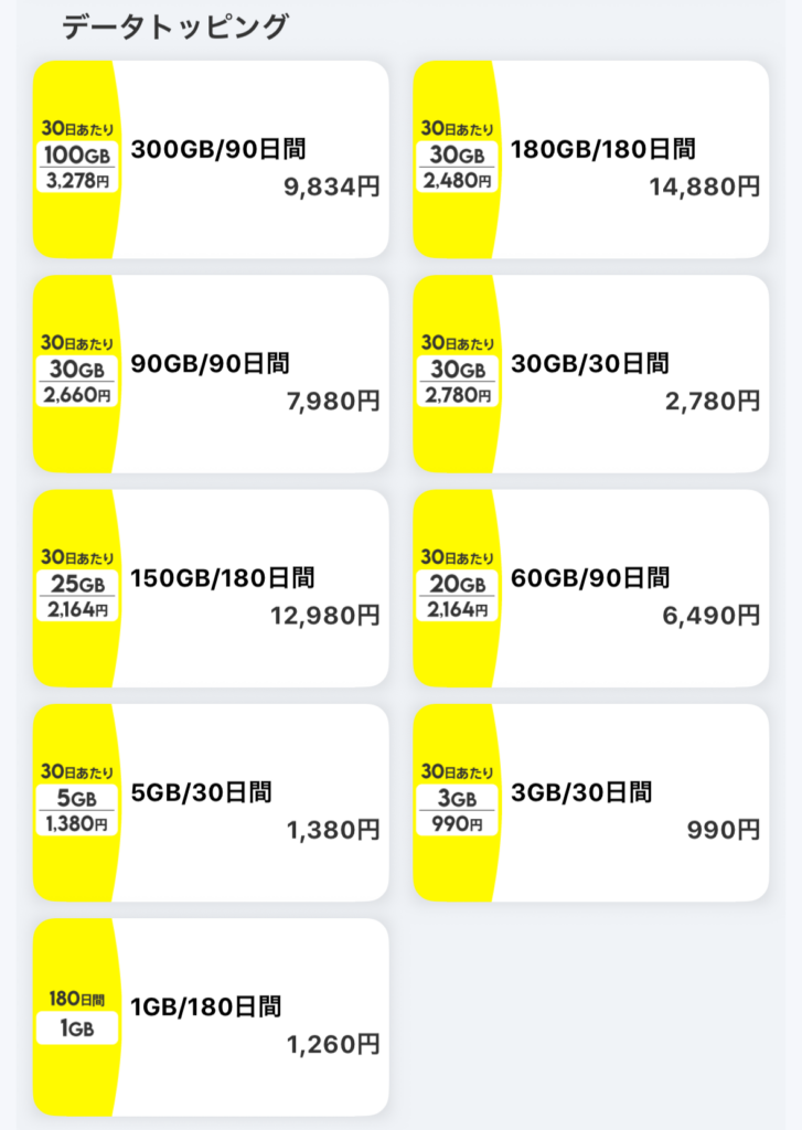 • 普段は「データ追加3GB(30日間):990円(税込)」でミニマルに。