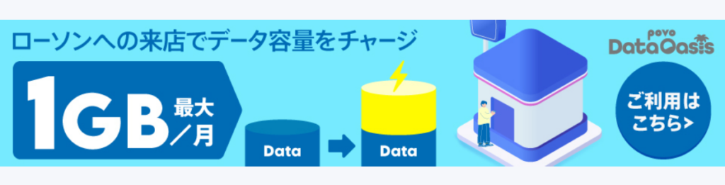 povoを使っていて意外と助かっているのが、ローソン来店時に取得できる0.1GBの通信量です。(1日1回、月10回まで、取得から24時間の有効期限あり)
